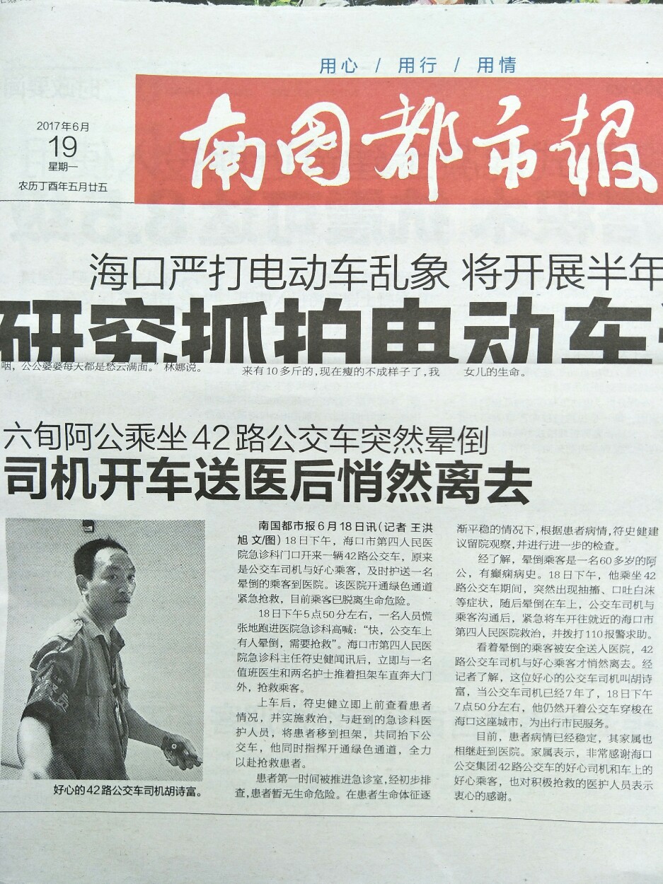 事件發(fā)生后,由于胡師傅沒有留名和聯(lián)系方式,媒體受醫(yī)院及暈倒乘客家屬委托在網(wǎng)上發(fā)布尋人啟事,尋找這位默默救人英雄,后經(jīng)確認,送醫(yī)的公交師傅就是海口市公交集團公交總公司42路駕駛員胡詩富,多虧胡師傅爭分奪秒,將公交車變身“救護車”。目前老人在醫(yī)護人員的救助下,已恢復意識,身體也無大礙。
